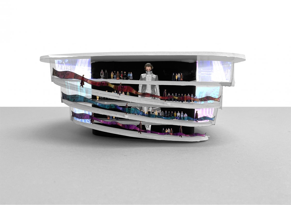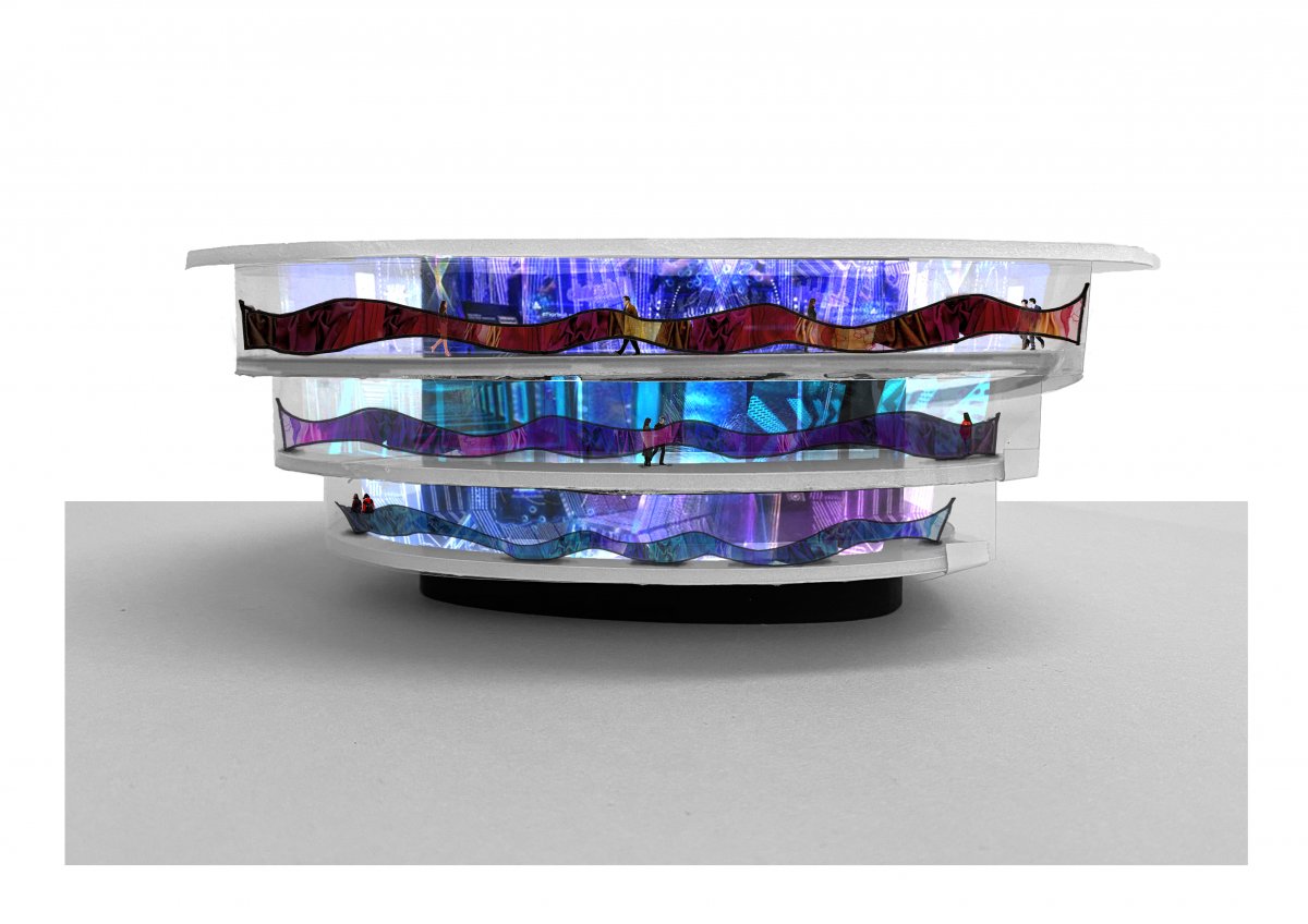 Jellyfish is a new shopping mall that combines virtual shopping with real shopping. The advanced 3d VR projection gives the user the best experience effect, and the continuous space enables the experiencer to immerse himself in the shopping experience. Different textiles are attached to the outside of each corridor connecting each floor. Viewing from the outside is like attaching a piece of clothing to the user. In the center of the mall is a huge screen and inside is warehouse. Some advertisements will be shown on weekdays.