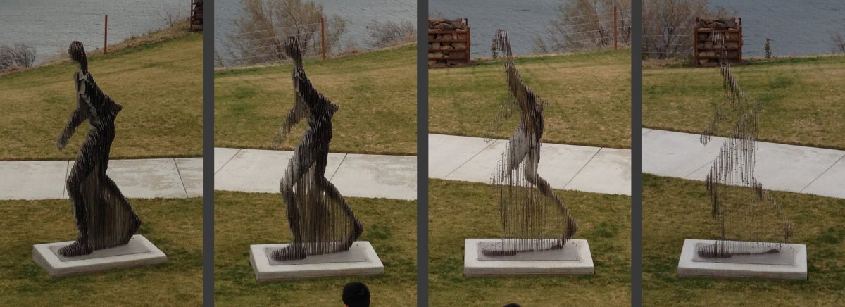 “When approached from the front or back, the sculpture seems to consist of solid steel, but when seen from