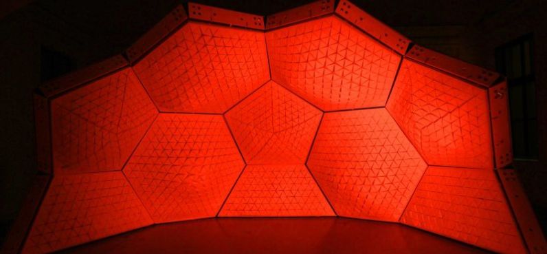 Their process stands in contrast to most current fabric architecture, which usually features soft fabric attached to a support structure. The Flextiles structures can be soft in some places and hard in others, transitioning smoothly from one to the other.