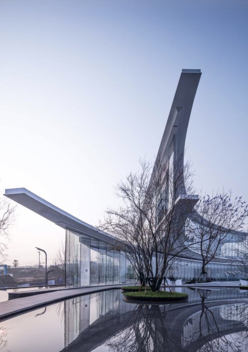Limited design language was amplified into usage of cliffs, riverbends, sunsets and mountains: the building form replicated the shape of the riverbend and mountain, using a simple curve to draw a stream in the sky. The triangular site also showed a clear sense of direction due to the curved cut across it.