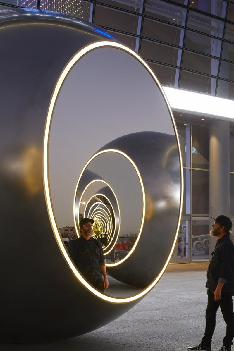 “Seeing spheres is a public space that contains you and contains multitudes,” said Eliasson. “We often think of public space as empty, negative space in the city, viewed from a car or crossed on the way to somewhere else. Seeing spheres offers a place to pause, where you see yourself from the outside, as a participant in society.”