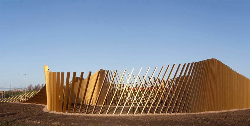 the work of british architect ian mcchesney, ‘blaze’ is an outdoor sculpture designed for installation along disparate segments of highway in middlesbrough, UK. the first construction phase of the project has seen a sculpture roughly 35-meters square and 4-meters tall erected along the A66 motorway.