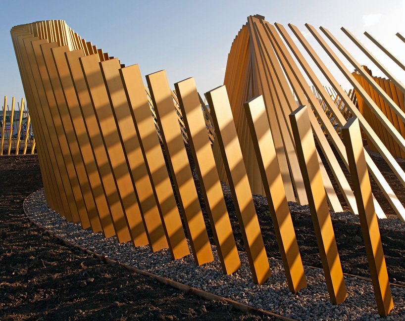 ‘blaze’ is composed of 472 staves of aluminum, positioned at successive angles to one another in four undulating curves. seen from different perspectives, the segments appear to create crosses and other gridded patterns, an effect enhanced by the fact that the staves are not fixed and rigid but instead shift slightly with the wind. the sculpture is composed of gold anodized aluminum, designed to catch the sunlight in unusual ways to add interest to the relatively desolate landscape.