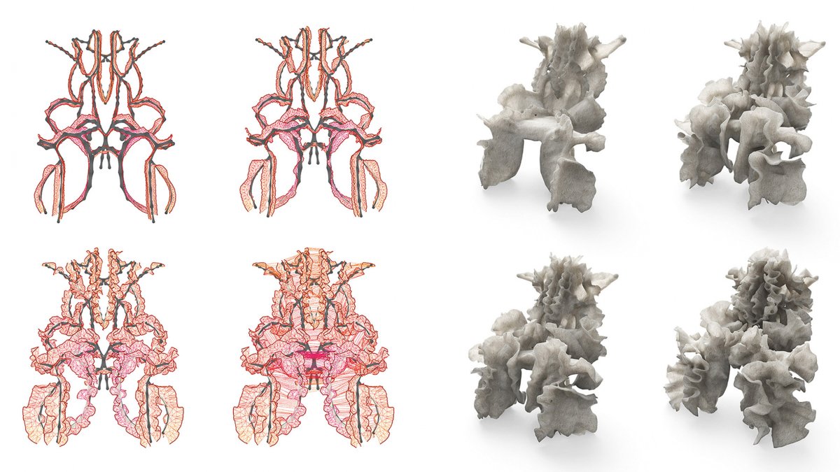 Students Noura Mheid, Hameda Janahi, Minzi Jin, Zoukai Huo found inspiration in the traditional craft of felt-making as well as the differential growth patterns found in nature – which is what gives their finished structures their distinctive, seaweed-like curls.