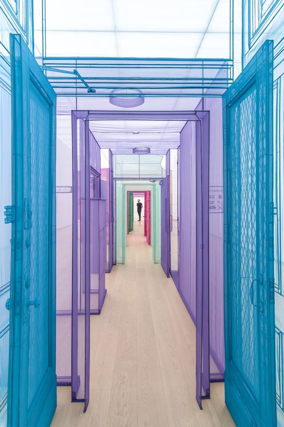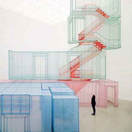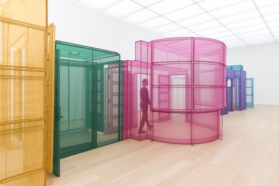 Suh's work has a central focus on architecture, space, and identity.[2] His early work blended into the gallery space and was barely discernible to the viewer as art. His most famous works are made of nylon or silk skillfully sewn into forms that represent spaces in Suh's life to scale. Immigrating to the United States affected how Suh interpreted home and created an overarching theme in his works where he explores space and how we interact with it.[2] This can be seen in his piece, "Home Within Home Within Home Within Home Within Home"[7] which is a silk replica of his childhood home, as well as his piece "Fallen Star" that featured a traditional Korean home crashing into a Los Angeles building.[8] Suh also challenges the uses of varies materials, for instance, "Do Ho Suh: 348 West 22nd Street" is a work created with luminous swaths of translucent polyester, which features his own history of migration from Korea to New York, a replica of the ground-floor residence when he first arrived the United States. Moving to the US removed the association Suh had to his father, "I felt relieved when I went to the states, I felt much more freedom".[