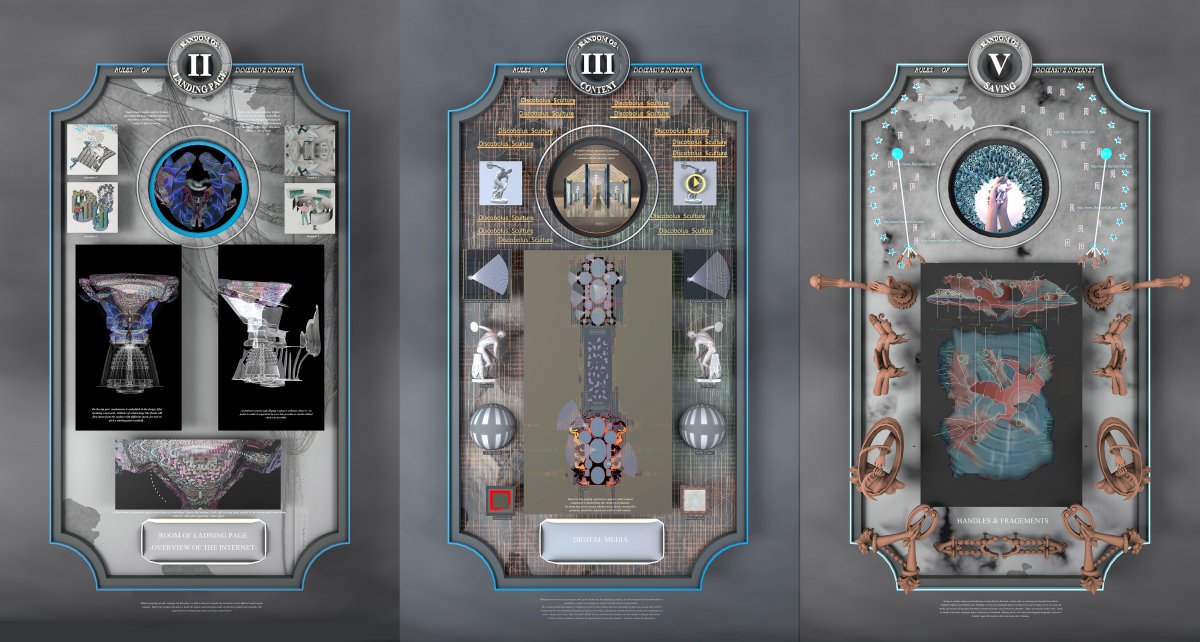 The project explores a spatial system for translating search engine and internet surfing from the 2D screen into an immersive experience in the virtual world. Speculating every webpage will be transcribed by future architects into a room. By noticing the quality of randomness experienced in daily life surfing ( constantly exposed to something new and surprising), its believed as the core driving force of how internet boosts the creativity of users. Architecture in virtual is redesigned for curating this experience. The project trying to match existing search engine feature into traditional architectural elements such as doors, corridors, and spatial layout, challenging space as a media to process the heterogeneous and hyperspeed access activities happens every second on the internet. How could architecture inhabit overwhelming information and organize the complexity of internet framework at the same time? ‘ Random OS ’ pictures the system as a starting point which could be constantly evolved through critically think through existing architecture knowledge.Towards countless possibilities that human can achieve by inhabiting inside the immersive internet world, excitement and subjectivity are what empowers and undermine the project contradictorily.