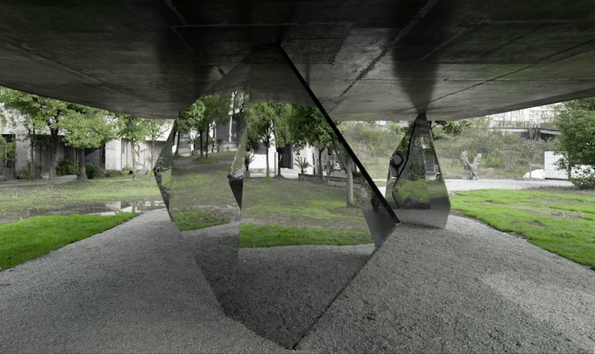 Inspired by the idea of creating a rock garden, and Wang’s ongoing ‘Rockery Series’, the team propped up the pavilion’s top with six sock-shaped structures made from thin, layered steel sheets marked by indentations created with a padded hammer. “We tried to cut the rockery sculpture into pieces to form the spatial order,” said the architects in an interview. “And with the adoption of the cast stainless steel, the pavilion demonstrates the quality of reflecting the surroundings into the interior space.”