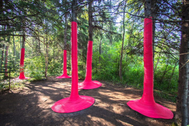 With its striking pink vibrant color the installation ‘Pink Punch’ is meant to attract visitors. Using 5000 linear feet of natural latex rubber rope, New York based architect, Nicholas Croft, and landscape designer and artist Michaela MacLeod, wrapped 7 trees from a height of 10 feet down to their bases in pink. At the ground, the rope continues to wind around the base of each tree, creating a 3-4 foot radial seating area. By carefully wrapping the rope around each tree, Nicholas Croft and Michaela MacLeod wrapped ‘distinguish garden from wilderness in a non-traditional way.’